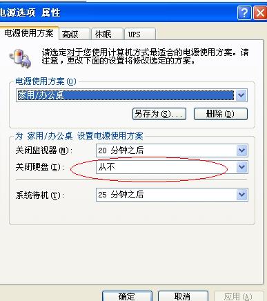 打开控制面板----电源选项---在电源使用方案里[关闭硬盘]项选择 从不---点确定。