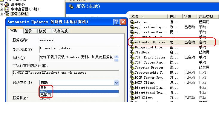 在“开始”→“运行”→输入“services.msc /s”打开系统服务,找到“Automatic Updates”的项目,将它禁止,即可。参见下图所示