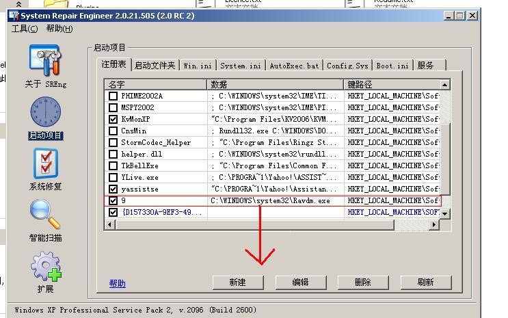 打开System Repair Engineer(也就是你的扫描日志软件SREng.exe),使用“启动项目,注册表”来删除以下选项。