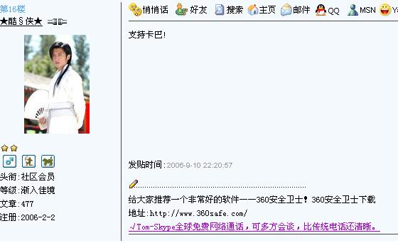 我有足够的理由相信“360安全卫士”就是★酷§侠★!这两人的个性签名都一样!他进行人身攻击!侮辱所有使用瑞星的人!虽然我用的不是瑞星,但我依然感觉愤怒!使用什么软件是人家的自由,你无权侮辱使用你不喜欢的软件的人!