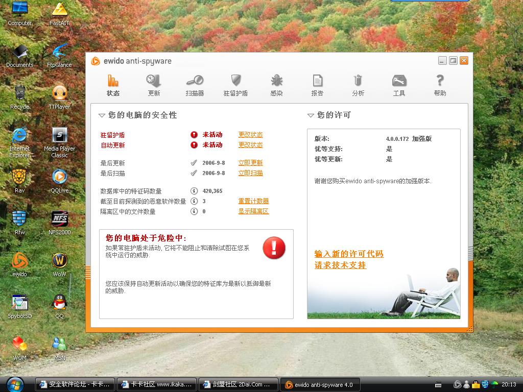 我是被病毒搞怕了呀!以前是用正版瑞星的,后来瑞星杀软被黑了,就装了kav6.0+瑞星防火墙(有规则包),好像大家说卡巴对木马不太强,所以就选择ewido来补充了。不知道这个组合怎么样?