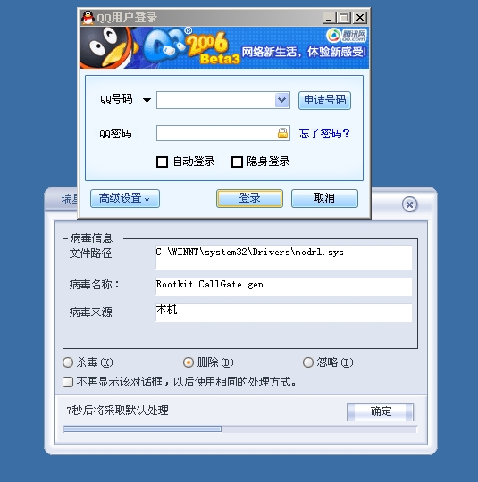 瑞星网站上说是WINDOWS下的PE病毒.Rootkit.CallGate.gen .我用瑞星杀过毒并清除了.但一打开QQ就自动显示
