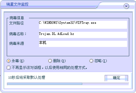 瑞星文件监控经常弹出病毒信息提示框,杀毒之后还出现,内容如下:文件路径:C:\Windowns\System32\VIPTray.exe 病毒名称:Trojan.DL.AdLoad.hz