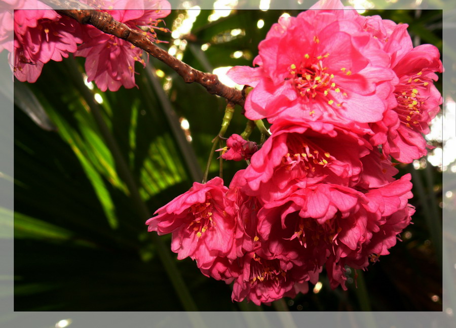 豆科紫荆属.该属为落叶乔木或灌木。单叶互生,全缘,叶脉掌状,有叶柄,托叶小,早落。花于老干上簇生或成总状花序,先于叶或和叶同时开放;花萼阔钟状; 5齿裂,弯齿顶端钝或圆形;花两侧对称,上面3片花瓣较小;雄蕊10,分离;子房有柄。荚果扁平,狭长椭圆形,沿腹缝线处有狭翅;种子扁,数颗。紫荆为落叶乔木,经栽培后常成灌木状。叶互生,近圆形,顶端急尖,基部心形,长6—14厘米,宽5—14厘米,两面无毛。花先于叶开放,4—10朵簇生于老枝上;小苞片2,阔卵形;花玫瑰红色,长1.5—1.3厘米,小花梗纲柔,长0.6—1.5厘米。荚果狭披针形,扁平,长5—14厘米,宽1.3—1.5厘米,沿腹缝线有狭翅不开裂;种子2—8颗,扁圆形,近黑色。花期4—5月。