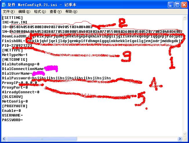 ( 用户)ID和序列号(2)都加了长串的数字;以及PID(进程ID)(3)、DialPassword (上网电话密码)(4)和代理IP(ProxyIP)(5)都是添了东西!