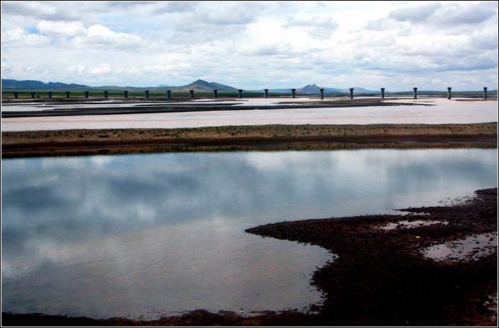 戈壁和万丈盐桥 铁路出了德令哈后,沿途完全是一片戈壁荒漠的景象,很长一段都见不到人烟,只有偶尔孤零零的几座道班工的小房子。大部方地方都生有一些生命力顽强的荆棘,被称为“骆驼草”,一丛丛互不相连,其间布满尚不太厚的黄沙,远处山脉起伏,山上隐隐现出血红的色调,景象苍茫浑荒,幸运时还可以见到一群群的野骆驼。绕过铁路左方的海拔4040米的阿木尼克山,铁路开始向南行驶,在此之前一直是向西。215国道又渐渐与铁路并行。下来就可见青藏线最壮观的景象之一—“万丈盐桥”,万丈盐桥坐落在距格尔木60公里的察尔汗盐湖上,全长32公里,桥的两面分别是东达布逊湖和南北霍鲁逊湖,这一段铁路的路基完全由各种盐的结晶体铸成,是一种难得一见的奇观。察尔汗盐湖是世界上最大的内陆盐湖之一,面积5848平方公里,盐层厚约为2—20米,海拔2670米。据说湖中储藏着的500亿吨以上的氯化钠,可供全世界的人食用1000多年。在高原强烈的阳光下,盐湖闪烁着迷人的光彩,白茫茫的、晶莹光滑的盐海一眼望不到边,铁路从此之上笔直平坦地架过,似梦似幻。在盐湖上行使时,会经过格尔木盐场和察尔汗钾肥厂,这里出产被誉为“盐湖之王”的珍珠盐,也是中国最大的钾肥生产基地,年产100万吨。