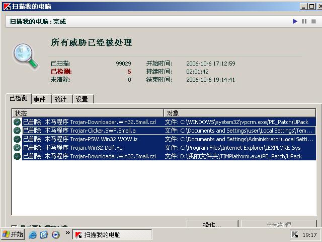 ........更新....杀毒.......10月6日,偶放弃了,删了瑞星,下了个卡巴,漫长的2小时杀毒,妈的!!5个木马