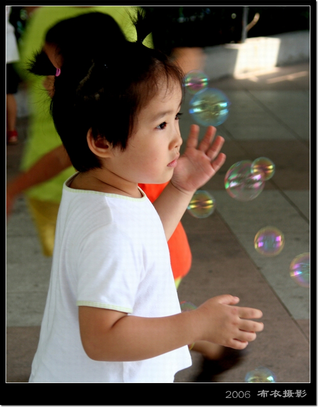 在公园里,看到一个男孩在吹泡泡,一个小女孩追着泡泡灭……很有意思