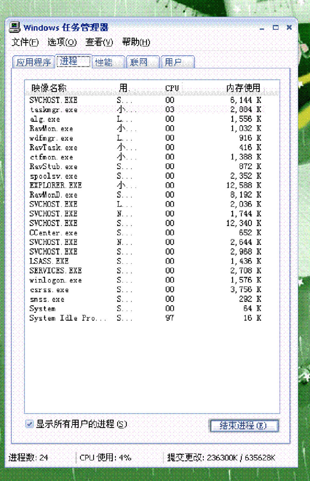 2、除任务管理器外,将其它窗口都关闭(包括QQ、傲游等),再截上面的两幅图发上来看看。