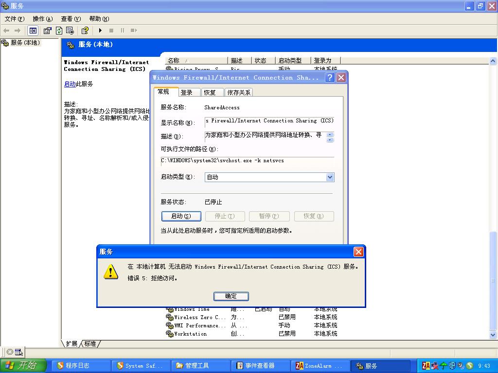 自己的屁股自己擦。没有人答清楚地问题,现在自己答:ZONEALARM防火墙把微软的防火墙关了。现在看来好像是这样。ZoneAlarm确实是强,世界品牌名不虚传。