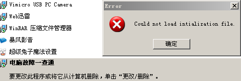 我以前下载了个“电脑故障一查通”的软件。现在想把它删除,但用了多办法也删不了。每次都弹出“could not load intialization file”这样的字。我用了“超级兔子”、“优化大师”等都删不了。我很郁闷啊?请问谁可以帮我啊?