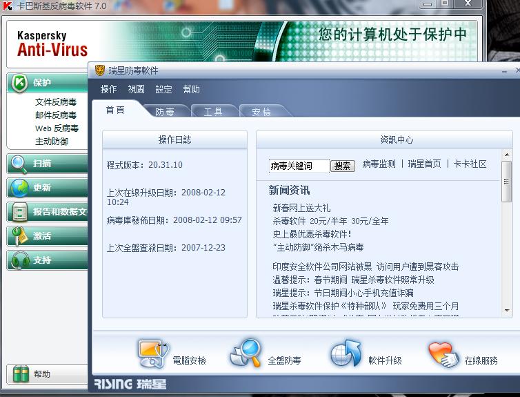 其实瑞星杀毒能力不是很差,但是都是医院制,反应过慢,至于卡巴,可能的确不错,但是卡巴误杀较多,瑞星显得比较谨慎(杀毒)其他你自己掂量