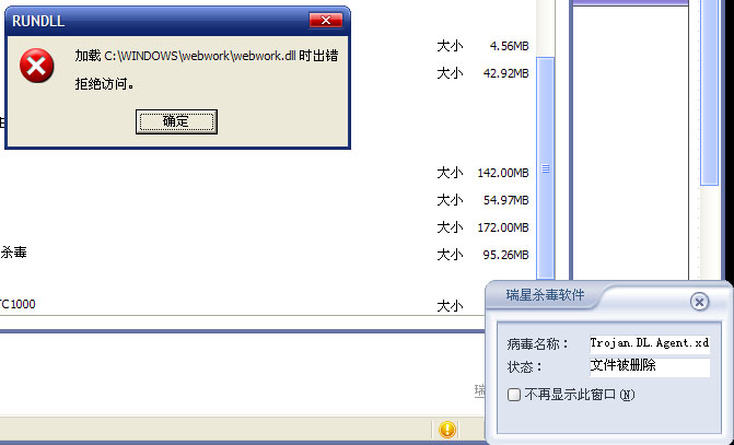 我最近中了一个叫Trojan.DL.Agent.xdw的病毒,他在WINDOWS下生成了一个叫做webwork的文件夹.并且可以在"添加或删除程序"中看到它.我点击"删除"出现下图(虽然瑞星显示删除,可是再点又有了).并且我尝试删除它的文件夹,可是删除之后刷新又出现了.我家电脑最近打开IE中会莫名其妙的弹出广告.请求帮助谢谢!附带日志
