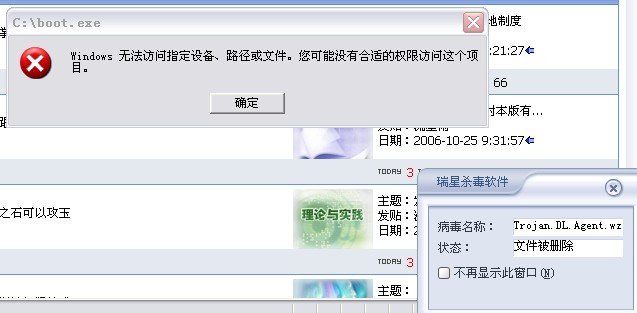 最近我的客户的网站www.hebgt.com,一打开首页就报发现Trojan.DL.Agent.wz病毒,清除后还有.我在服务器上也杀毒了,用瑞星18.50.21杀出了一个windows_network_hook.dll病毒,是在C:\windows目录下的.看瑞星的监控日志里有一个backdoor.asp.ace.uh 是忽略.