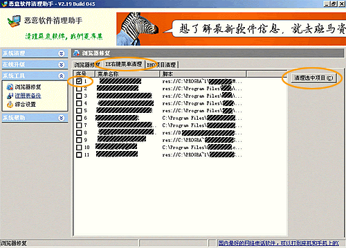 12、如果还需要清理您的IE右键菜单,可以点击“IE右键菜单清理”标签,可以对IE右键的菜单进行清理,勾选需要清理的项目,点击“清理选中项目”按钮进行清理。