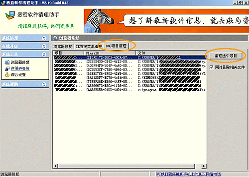 4、检测完毕后,点击“流氓软件清除”标签,勾选需要清除的软件,点击“清除”按钮
