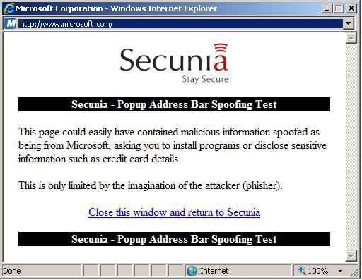 “这个问题的存在,使弹出窗口只能显示地址栏的一部分,从而对用户形成欺骗,以致其进行一些无意识的操作,”Secunia说道。该公司还进行了一个演示,在演示中,弹出窗口的地址栏显示的微软的网站地址,而显示的是来自Secunia的内容。