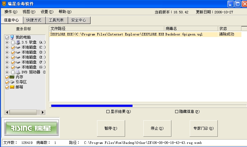 为何瑞星升级到18.50.42清除backdoor.gpigeon.uql后又有