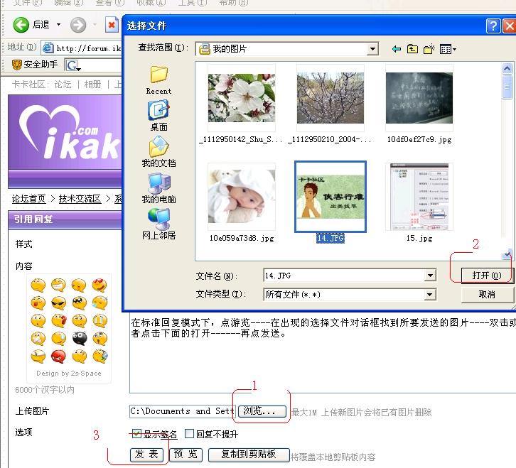 在标准回复模式下,点游览----在出现的选择文件对话框找到所要发送的图片----双击或者点击下面的打开------再点发表。