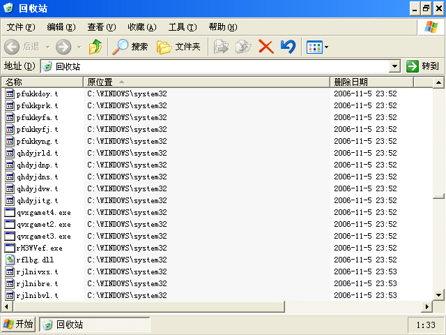 2、如果没有完全禁止所有的病毒程序运行,就在普通WINDOWS模式下删除木马/蠕虫文件,删除操作时会在同一位置生成数目不等的、文件名后缀为.t的文件,文件名为随机排列的8个小写英文字母。