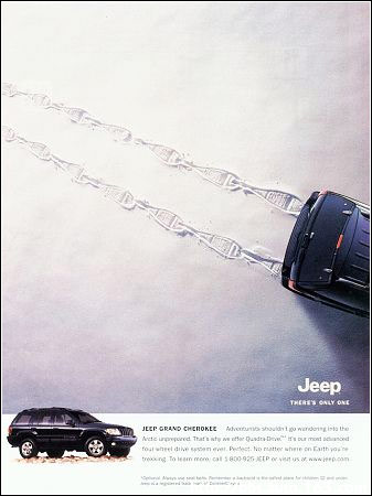 吉普越野车广告,行驶所经的路面,即使是雪地里,车轮也能留下一串串脚印一样清晰和深刻的印记,像安装了链条的装甲车一样,凸显出该车车轮的坚实和安全。