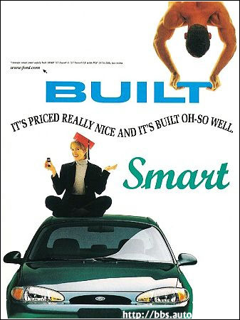福特汽车广告,造型如男性运动员一样健壮有型,价格又满足精打细算的女性的需求,同时具有博士一样的智慧和性能。