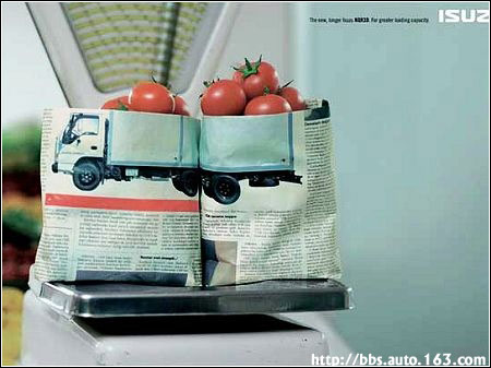 五十铃大型货车广告。两包满载西红柿的纸袋上图案巧妙的拼成一辆大货车。原来小型的货车也许不能满足您的需要,增长的车厢将你就像购买西红柿可以多装上一袋一样,满足大容量的需求。这回可以箱装多少就装多少了!
