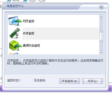 我家安装的瑞星杀毒软件`以前好好的,最进换了个系统,怎么实时监控的内存监控无法开启,是个黄颜色的伞`,怎么解决啊,我重新装了系统也是这样··