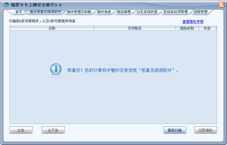 今天装了新版本的卡卡,界面友好,漂亮,即使眼困了,看着都觉得舒服,卡卡杀流氓的功能果然强大,这几天我觉得机子运行有点慢,在扫描电脑的时候,发现有个流氓,卡卡描述的是:影响电脑的运行速度。于是我把他给干掉了,这流氓还真TMD的烦。