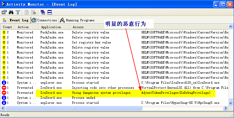 带毒运行IceSword并允许那个假冒的.sys加载后,IceSword的窗口是可以保留了;但是SSM的用户界面即刻被断开。当你试图再次开启SSM用户界面时——开启后立即被关闭。