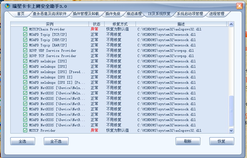重新启动电脑, 进入安全模式。运行LSPFix.exe,删除: