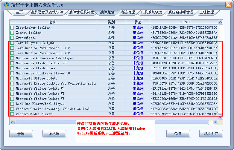 若显示没有免疫,那么在“开始”—“运行”中输入“regedit”,启动注册表编辑器,展开“HKEY_LOCAL_MACHINESOFTWAREMicrosoftInternet ExplorerActiveX Compatibility”分支,看下面是否有“{CFCDAA03-8BE4-11CF-B84B-0020AFBBCCFA}”(RealOne/Real Player使用)和“{6BF52A52-394A-11D3-B153-00C04F79FAA6}”(Windows Media Player使用)的项,若有,请删除。然后启动IE浏览器,点击菜单“工具”—“Internet选项”,切换到“安全标签”,调节Internet区域的安全级别为“默认级别”,然后再设置为“中级”,确定后应该就可以正常播放了。