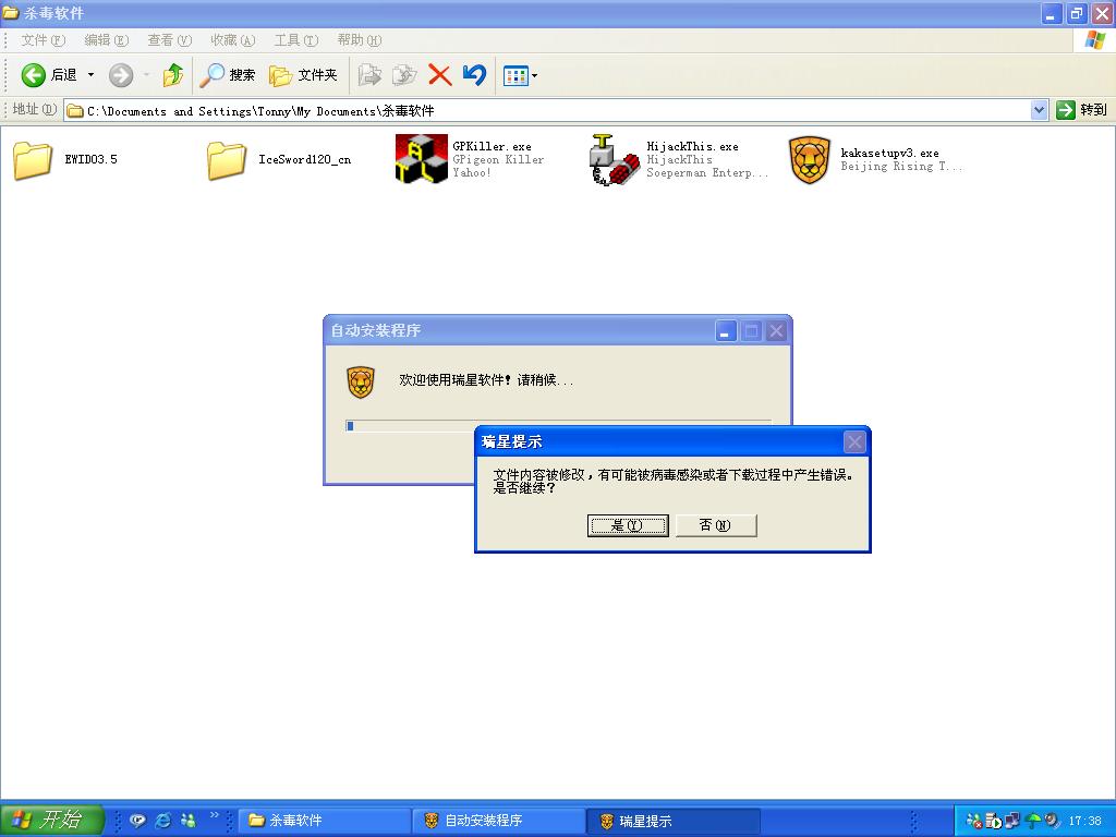 在瑞星官网上下的卡卡3.0,安装时提示“文件内容已被修改,有可能被病毒感染或下载过程中出现错误,是否继续”,如下图,点击继续后,安装程序长时间无响应,不知道是什么问题,是不是装了其他的反流氓软件就不能装卡卡,在线等答复,谢谢。