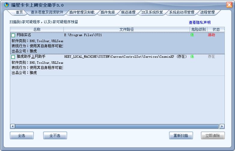用卡卡扫描,又显示雅虎助手上网助手有残留。