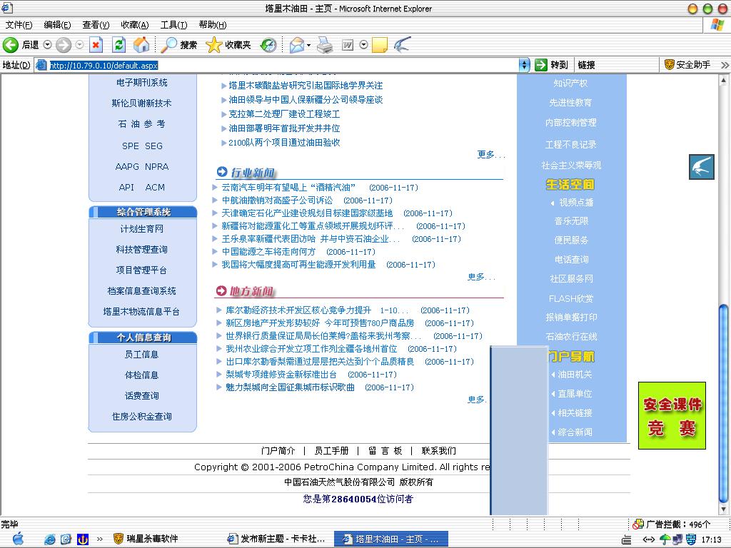 我们公司用的事瑞星2006的正版软件,我以前都不安装卡卡,有一次偶然安装上了卡卡,但随后问题就出来了,卡卡会将网页中的浮动小广告自动清除,本来这是好事情,但我们公司用的一些其它有用的东西也会被清掉,我试了很多的办法,都无法使这个网站上的东西显示出来,只有重新刷新页面.这样就造成了很多的麻烦.网址是这个:http://10.79.0.10/default.aspx 这个网页最右下脚有一个:门户导航,被卡卡搞得没有办法正常显示,我删除了卡卡还是一样,有谁知道怎么解决哦.