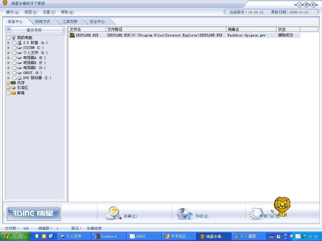 请大家帮忙看看,分别是瑞星显示的“清除成功”、用HijackThis1.99.1扫的系统日志、和用IceSword查看的进程,不知我到底该如何解决这个病毒?