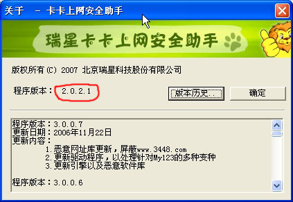 在IE里点安全助手——帮助——关于里显示我现在的版本号是2.0.2.1,但版本历史中的是正常的,我现在的是3.0.0.7。