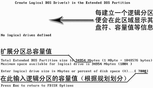 根据自己的分区方案,输入D盘的容量后回车,系统会自动为该区分配逻辑盘符“D”。因为扩展分区还没有分完,程序还会出现如上图所示的画面,要求用户输入下一个逻辑分区的大小。用户只要依次按照方案输入逻辑分区的大小即可,系统会自动给它们分配盘符。扩展分区分完后,系统会显示所有逻辑分区的数量和容量,并提示按“Esc”返回。