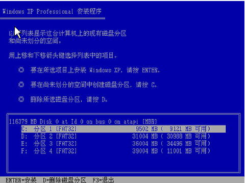 全中文提示,“要现在安装Windows XP,请按ENTER”,按回车键后,出现如下图所示