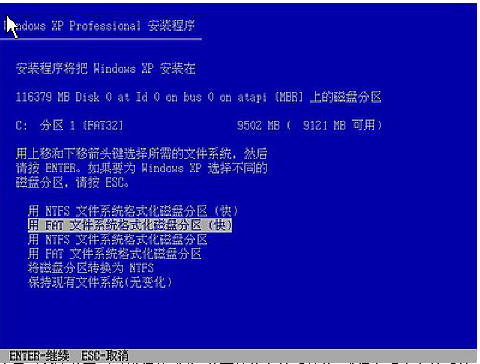 这里对所选分区可以进行格式化,从而转换文件系统格,或保存现有文件系统,有多种选择的余地,但要注意的是NTFS格式可节约磁盘空间提高安全性和减小磁盘碎片但同时存在很多问题和98/Me下看不到NTFS格式的分区,在这里选“用FAT文件系统格式化磁盘分区(快),按“Enter”键回车,(当然,你可以根据自己的情况作出适当的选择。)出现下图所示