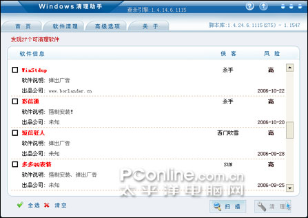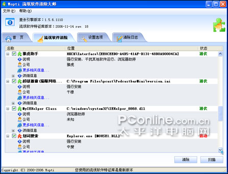 总结:经过这一项目的测试,恶意软件清理助手与其它五款流氓软件清理工具相比其差距是非常明显的。而对流氓软件进程描述最为详细的就算Wopti流氓软件清除大师了,它除了列出了流氓软件几乎所有的常规信息外,还提供了一个可以对该流氓软件进程进行进一步搜索的网络链接,用户可以打开这个链接从而去了解关于这个流氓软件进程的方方面面知识。