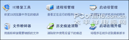 这款软件所附带的精品小工具很多,包括IE修复器、进程项管理器、启动项管理器、历史痕迹清除器和文件粉碎机等,基本上都是与安全相关的工具。