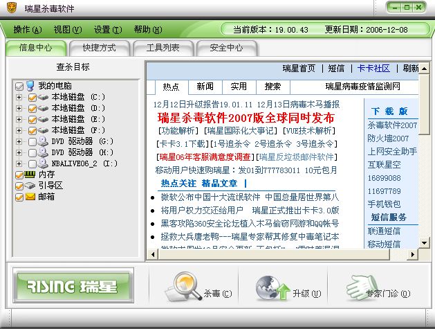 我的瑞星杀毒软件是三天前升的现在是19.00.43,可是升完后还是显示2006版,接下来两天再点升级总是一闪而过.跟本反应.这是为什么呀!!!好郁闷呀!!