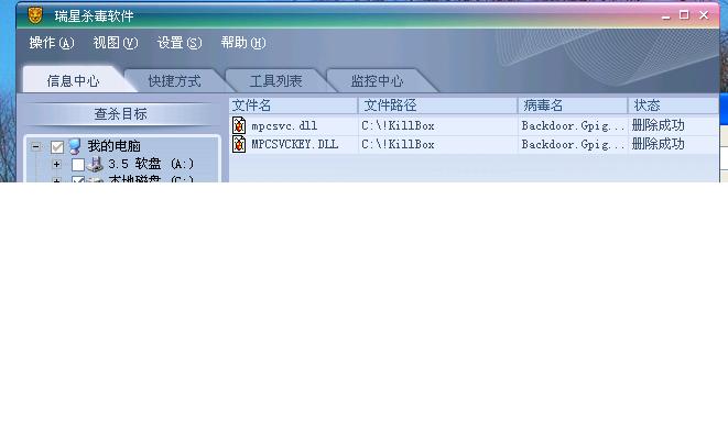 猫叔,病毒真太狡猾了,看,瑞星这样杀行不行,不知重启后,它还在不在