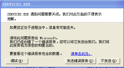 这个C:\WINDOWS\SERVICES.EXE根本无法在我的系统中运行(见图)。调用dwwin调试了半天——还是瞎菜!!