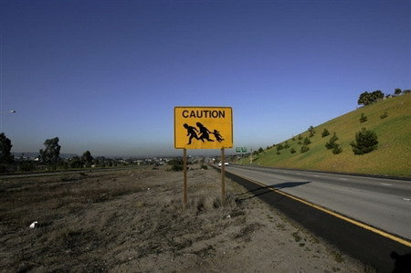 2006年1月25日,美国加州圣易西铎市,美国墨西哥交接的高速公路旁立着标牌,提醒司机注意横穿马路的非法移民。