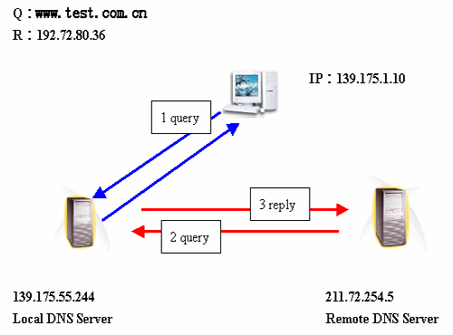 我们举例说明,假设我们要查询网际网路上的一个名称为www.test.com.cn,从此名称我们知道此部主机在中国CN,而且要找的组织名称test.com.cn此网域下的www主机,以下为名称解析过程的每一步骤。