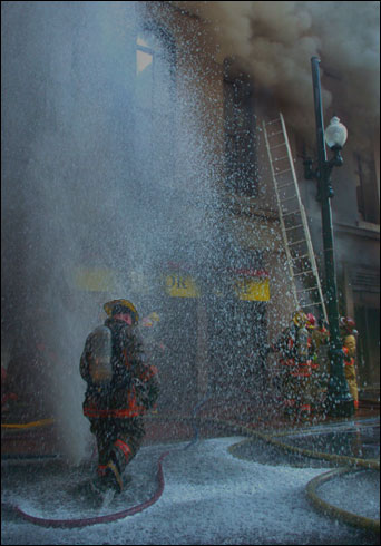 8月12日美国新奥尔良,消防员正在搬梯子扑灭该市一处大火。(国际在线独家资讯 付华一)