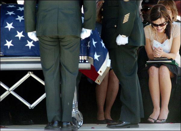 5月17日美国俄克拉何马州萨帕尔帕市,一名美国士兵在伊拉克巴格达阵亡后,这名士兵的妻子和家人出席他的葬礼。(国际在线独家资讯 付华一)