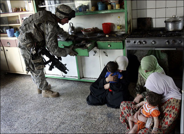 10月3日伊拉克巴格达,美军士兵正在伊拉克民宅中进行搜查,几名伊拉克妇女和儿童坐在地上等待搜查行动结束。(国际在线独家资讯 付华一)